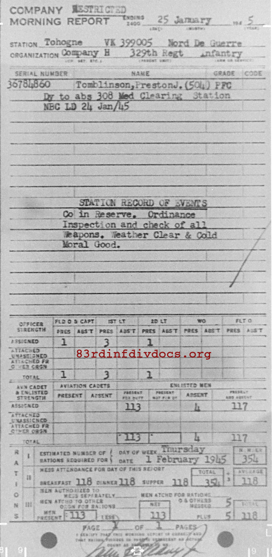 Morning report H/329 for January 25, 1945