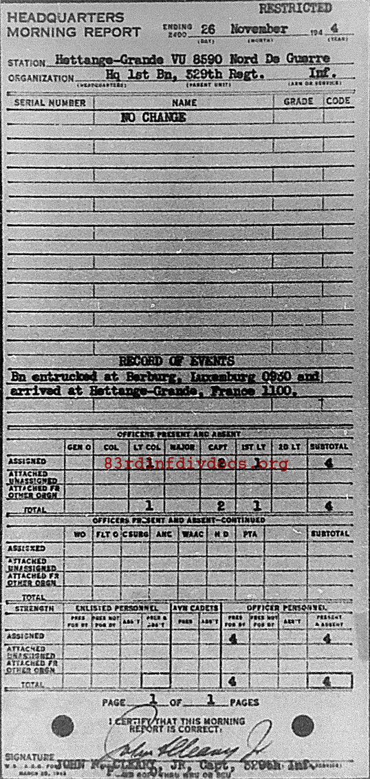 Bn entrucked at Berburg, Luxemburg 0930 and arrived at Hettange-Grande, France 1100.