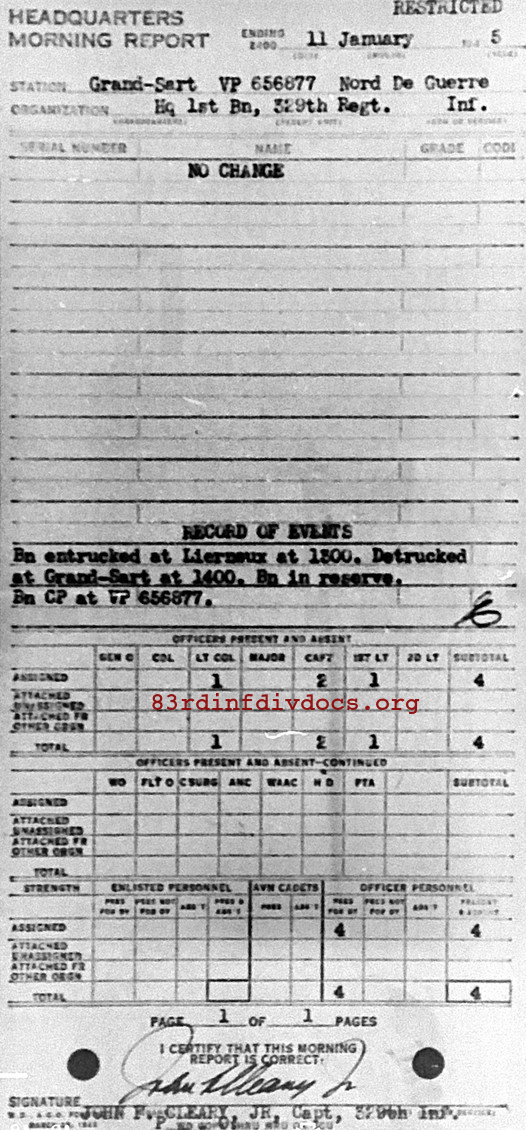 Bn entrucked at Lierneux at 1300. Detrucked at Grand-Sart at 1400. Bn in reserve. Bn CP At VP656877.