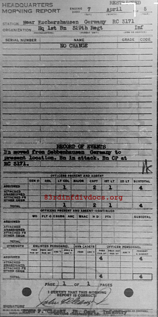 Bn moved from Sabbenhausen, Germany to present location. Bn in attack. Bn CP at RC 3171.