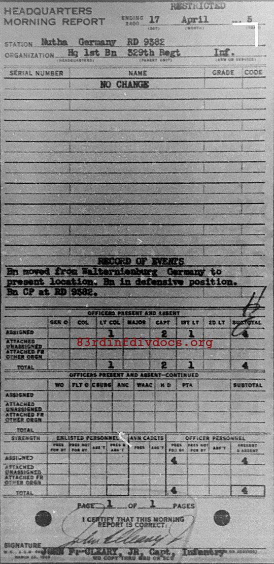 Bn moved from Walternienburg, Germany to present location. Bn in defensive position. Bn CP at RD 9382.