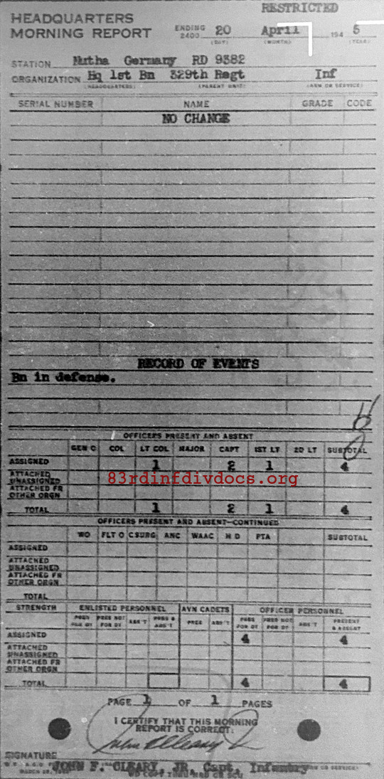 Morning report HQ1BN/329 for April 20, 1945