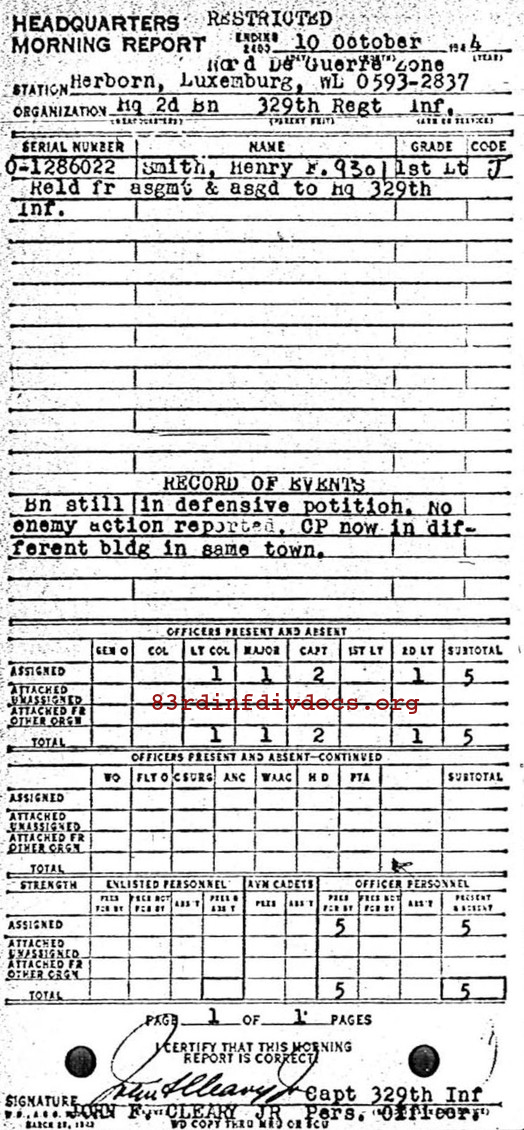 Morning report HQ2BN/329 for October 10, 1944