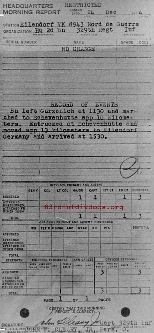 Bn left Gurzenich at 1130 and marched to Schevenhutte app 10 Kilometers. Entrucked at Schevenhutte and moved app 13 kilometers to Eilendorf Germany and arrived at 1530.