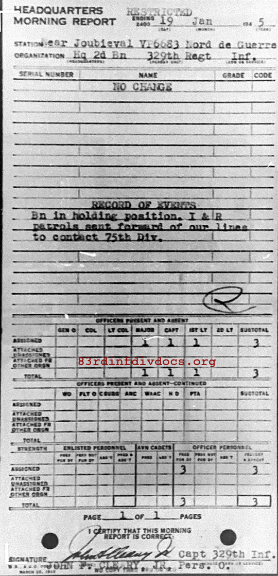 Bn in holding position. I and R patrols sent forward of our lines to contact 75th Div.