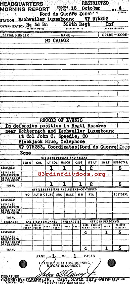 In defensive position in Regtl Reserve vicinity Echternach and Eschweiler Luxembourg. Lt Col John C Speedie, CO Blackjack Blue, Telephone. VP975253, NdG
