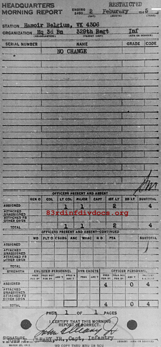 Morning report HQ3BN/329 for February 2, 1945