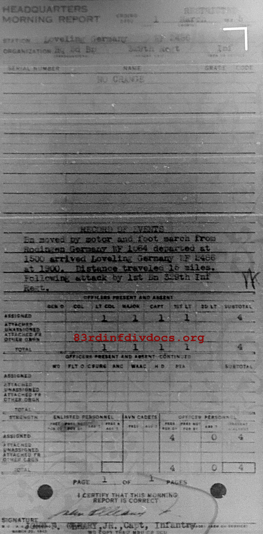 Bn moved by motor and foot march from Rodingen, Germany, wF1064 departed at 1500 arrived Loveling Germany wF2486 at 1900. Distance traveled 16 miles. Following attack by 1st Bn 329th Inf Regt.