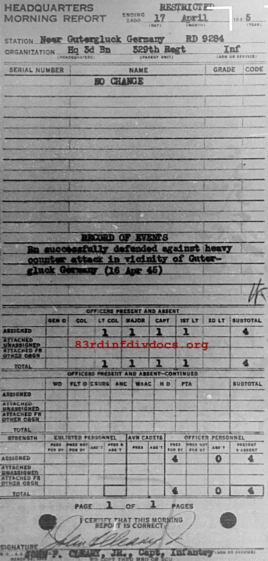 Morning report HQ3BN/329 for April 17, 1945