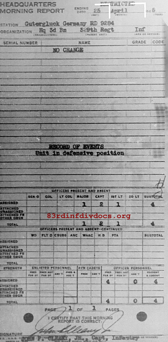 Morning report HQ3BN/329 for April 25, 1945