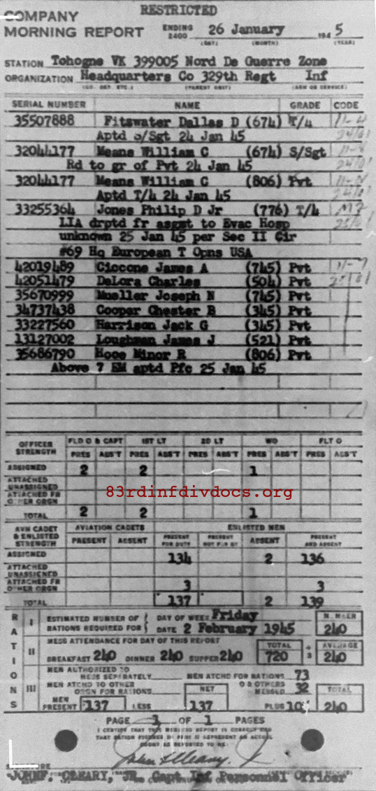 Morning report HQCO/329 for January 26, 1945