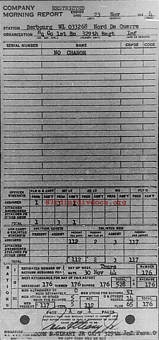 Morning report HQCO1BN/329 for November 23, 1944