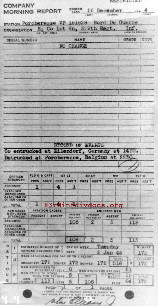 Co entrucked at Eilendorf, Germany at 1430. Detrucked at Porcheresse, Belgium at 2230.