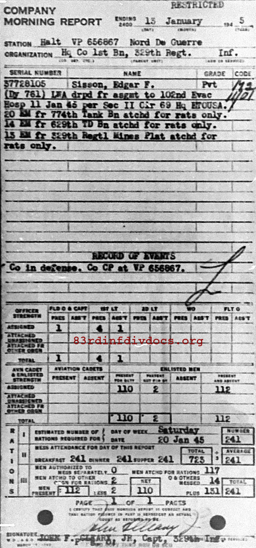 Morning report HQCO1BN/329 for January 13, 1945