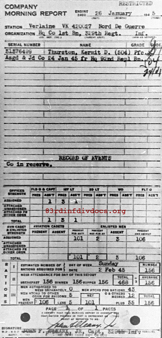 Morning report HQCO1BN/329 for January 26, 1945