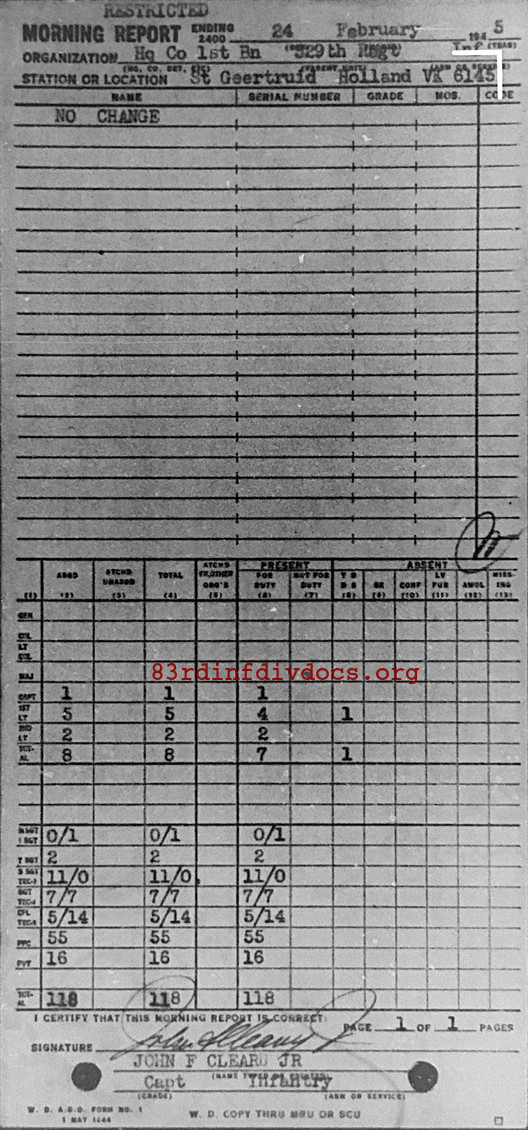 Morning report HQCO1BN/329 for February 24, 1945