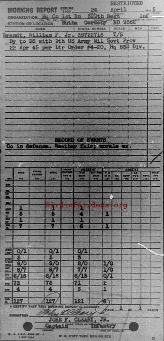 Morning report HQCO1BN/329 for April 24, 1945