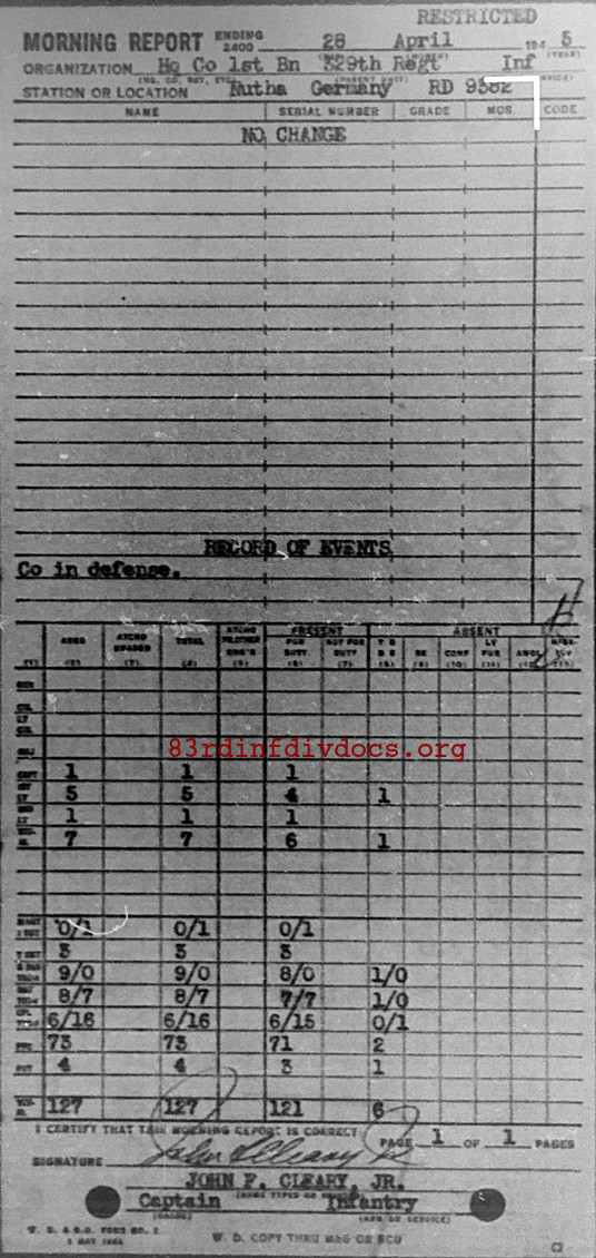 Morning report HQCO1BN/329 for April 28, 1945