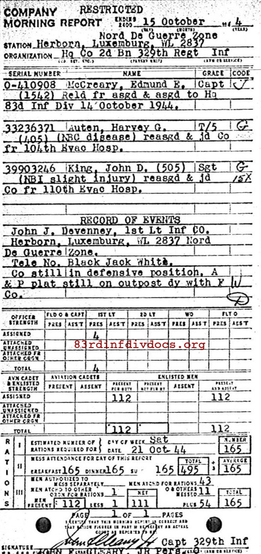John J Devenney, 1st Lt Inf CO. Herborn Luxembourg, WL2837 NdG Zone. Tele No. Black Jack White. Co still in defensive position. A&P plat still on outpost dy with F Co.