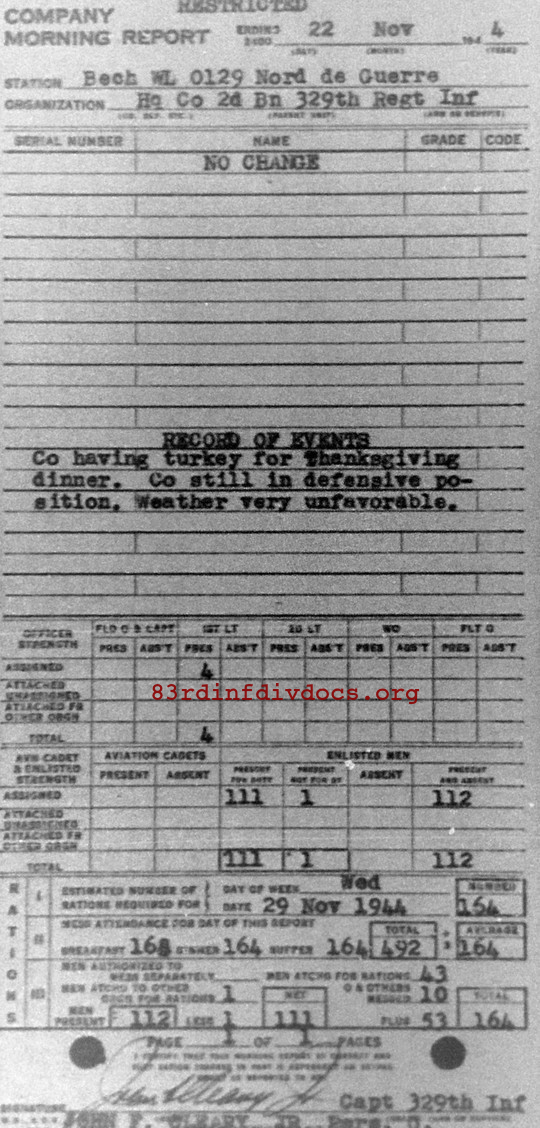 Co having turkey for Thanksgiving dinner. Co still in defensive position. Weather very unfavorable.