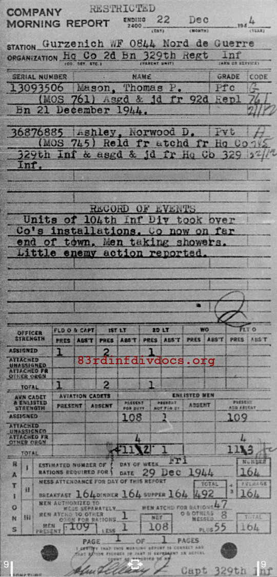 Units of 104th Inf Div took over Co's installations. Co now on far end of town. Men taking showers. Little enemy action reported.
