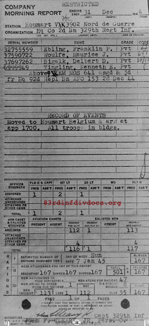 Morning report HQCO2BN/329 for December 31, 1944