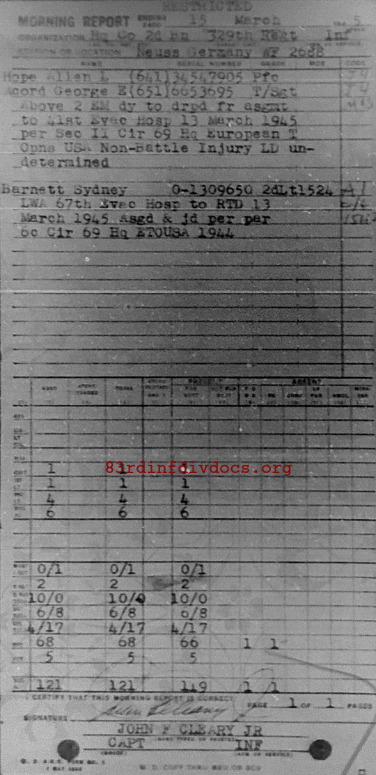 Morning report HQCO2BN/329 for March 15, 1945