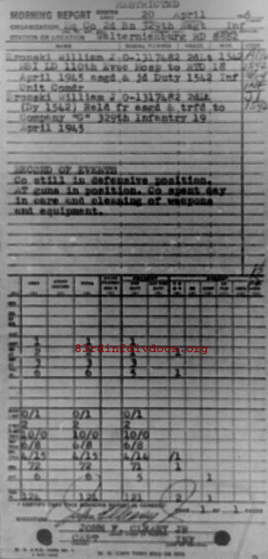 Co still in defensive position. AT guns in position. Co spent day in care and cleaning of weapons and equipment.