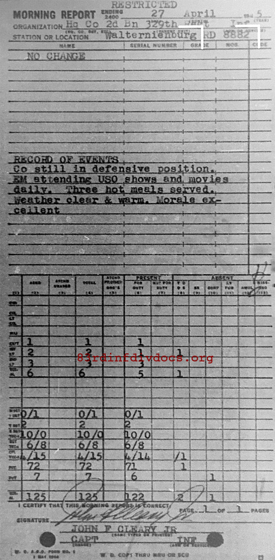 Co still in defensive position. EM attending USO shows and movies daily. Three hot meals served. Weather clear and warm. Morale excellent.