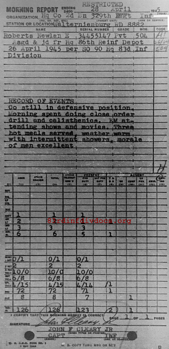 Morning report HQCO2BN/329 for April 28, 1945