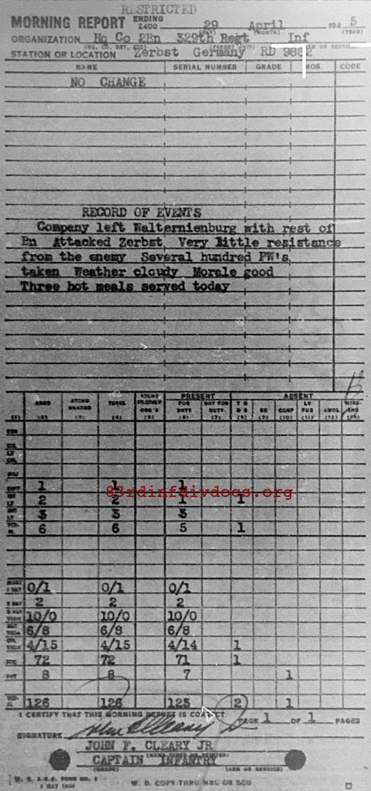 Company left Walternienburg with rest of Bn. Attacked Zerbst. Very little resistance from the enemy. Several hundred PW's taken. Weather cloudy. Morale good. Three hot meals served today.