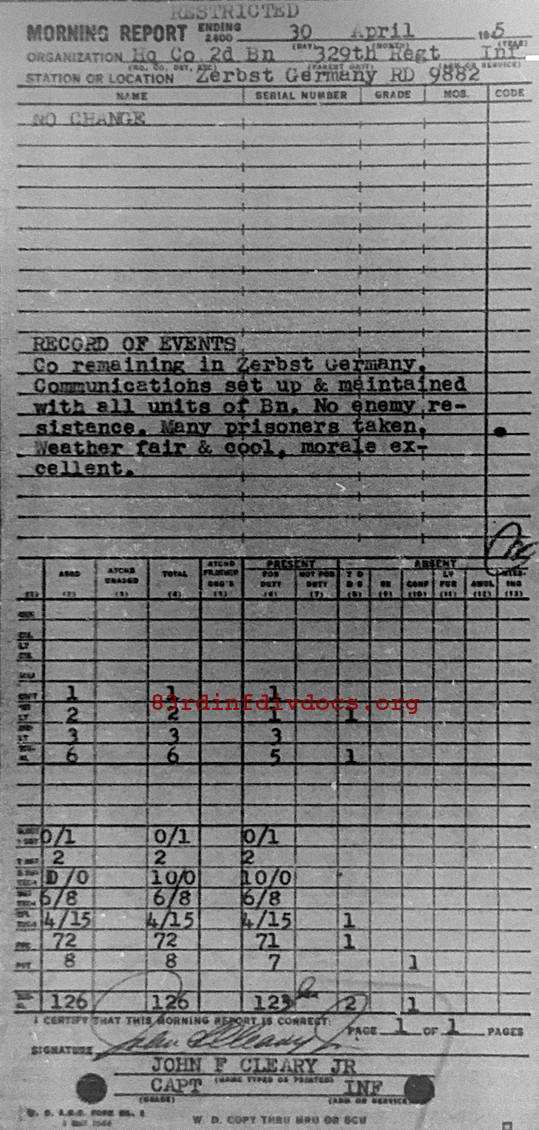 Co remaining in Zerbst Germany. Communications set up and maintained with all units of Bn. No enemy resistance. Many prisoners taken. Weather fair and cool. Morale excellent.
