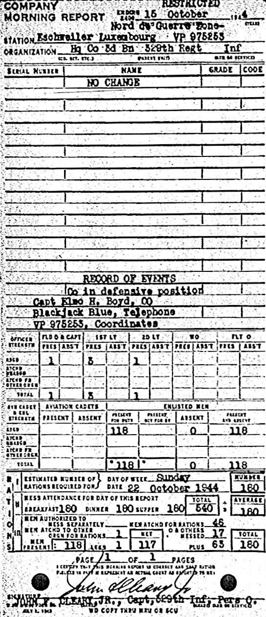 Co in defensive position. Capt Elmo H Boyd CO. Blackjack Blue. Telephone VP975253 coordinates