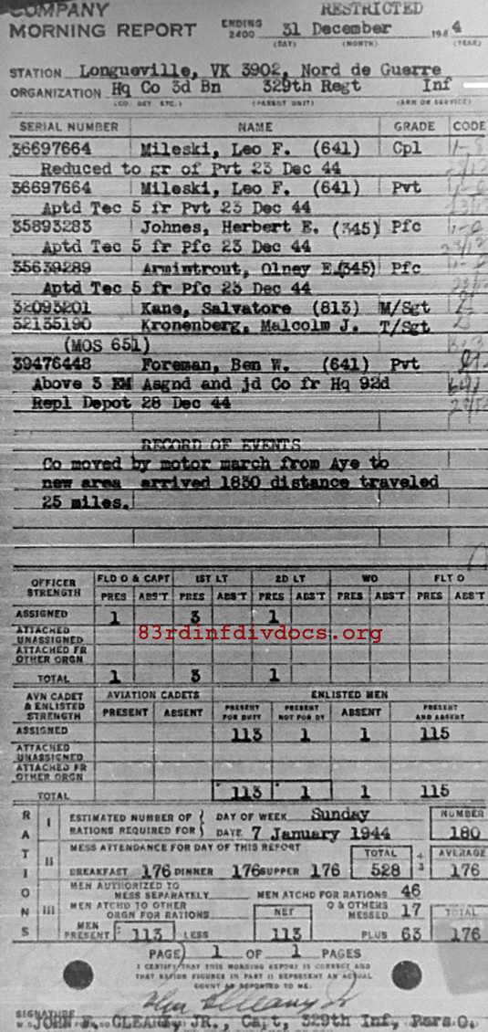 Morning report HQCO3BN/329 for December 31, 1944