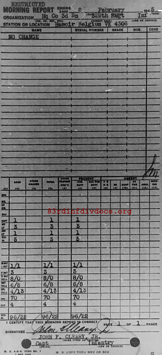 Morning report HQCO3BN/329 for February 2, 1945