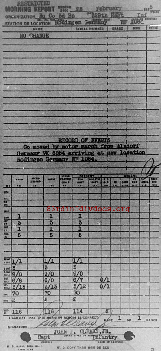 Co moved by motor march from Alsdorf Germany VK8854 arriving at new location Rodingen Germany WF1064.