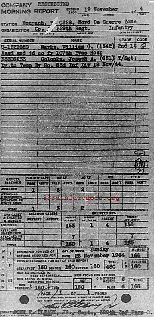 Morning report I/329 for November 19, 1944