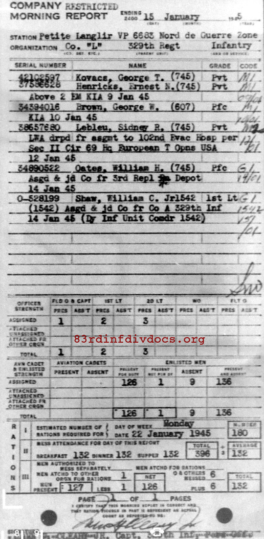 Morning report L/329 for January 15, 1945