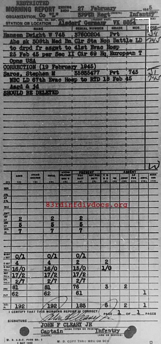 Morning report L/329 for February 27, 1945