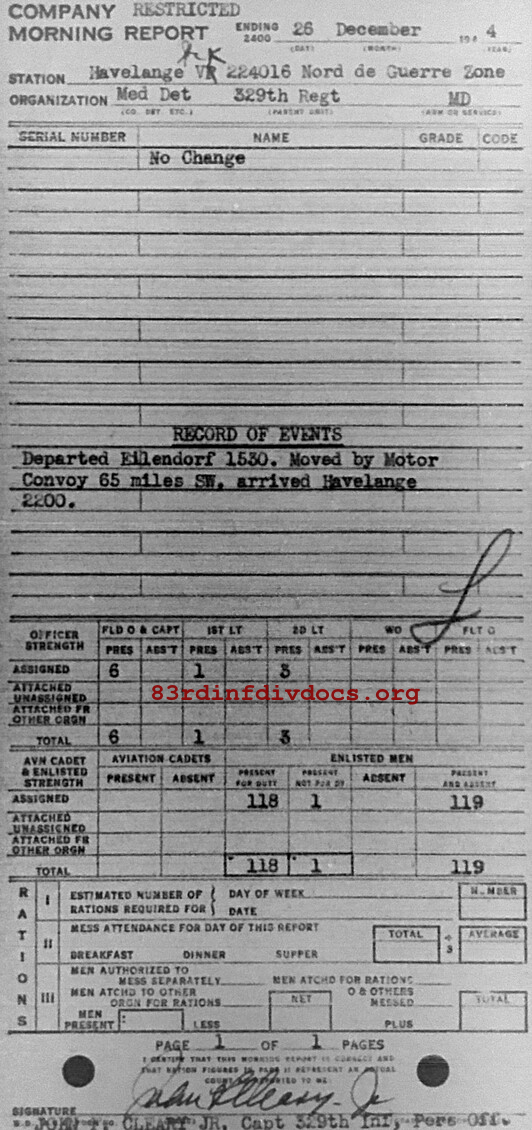 Departed Eilendorf 1530. Moved by Motor Convoy 65 miles SW. arrived Havelange 2200.