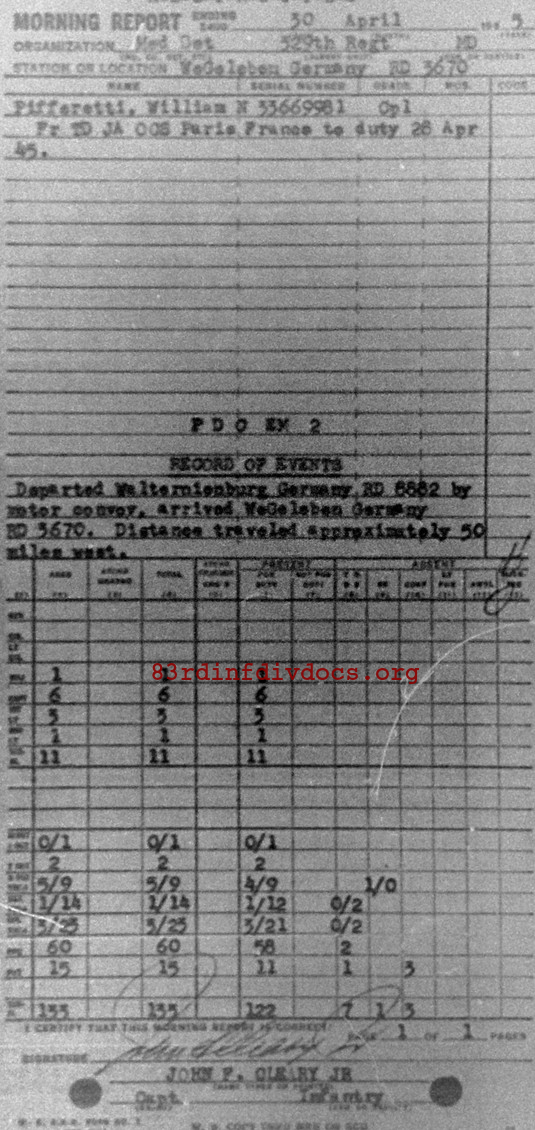 Departed Walternienburg, Germany RD8882 by motor convoy, arrived WeGeleben, Germany RC3670. Distance traveled approximately 50 miles west.