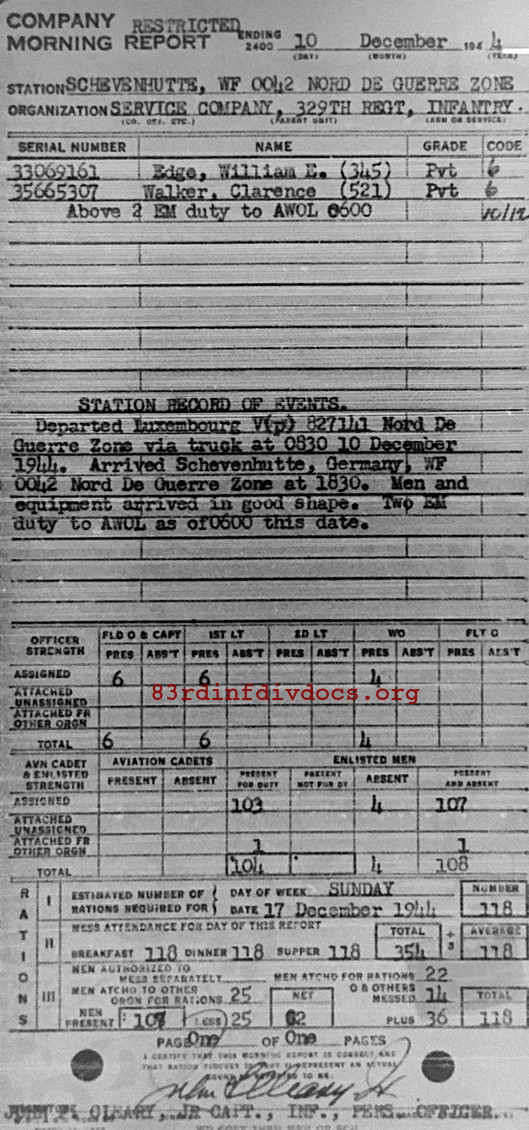 Departed Luxembourg vP827141 NdG zone via truck at 0830, 10 December 1944. Arrived Schevenhutte, Germany wF0042 NdG zone at 1830. Men and equipment arrived in good shape. Two EM duty to AWOL as of 0600 this date.