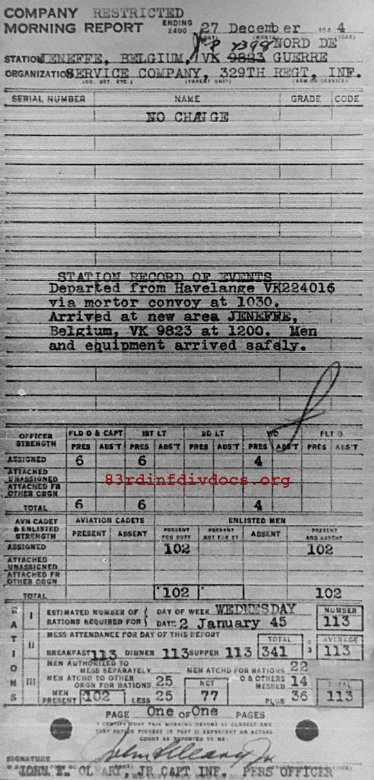 Departed from Havelange VK224016 via motor convoy at 1030. Arrived at new area Jeneffe, Belgium, VK9823 at 1200. Men and equipment arrived safely.
