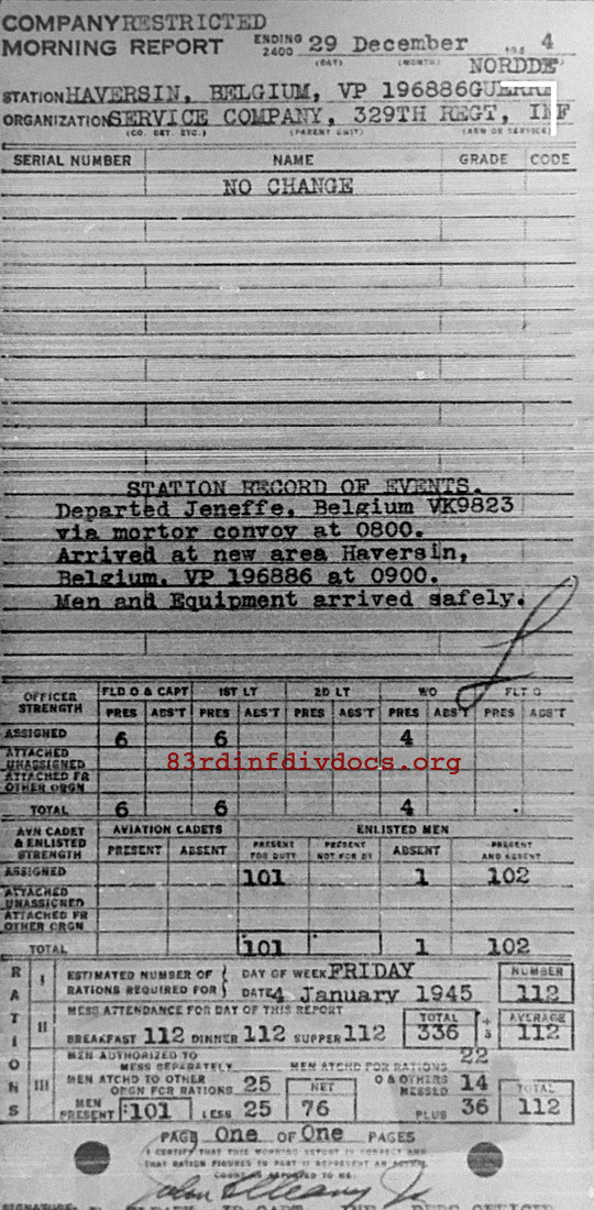 Departed Jeneffe, Belgium VK9823 via motor conovy at 0800. Arrived at new area Haversin, Belgium VP196886 at 0900. Men and Equipment arrived safely.