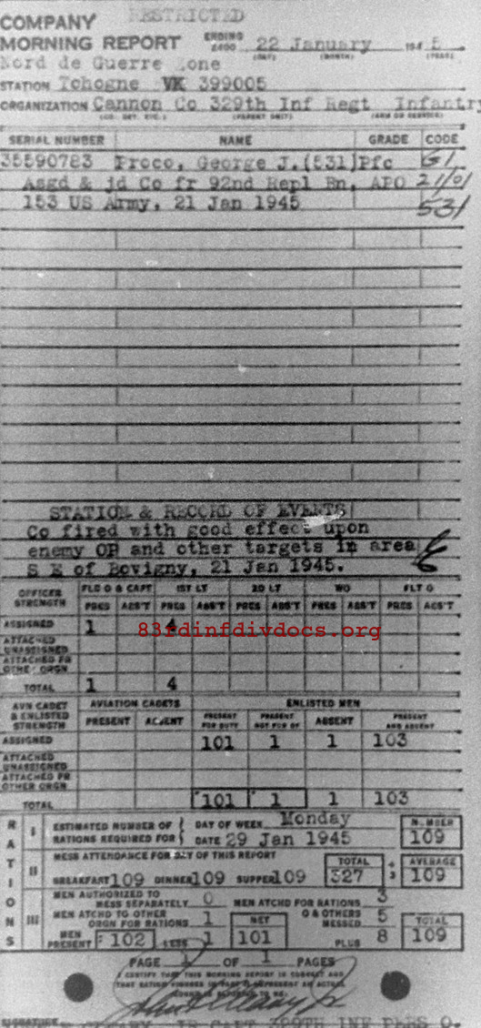 Co fired with good effect upon enemy OP and other targets in area SE of Bovigny, 21 Jan 1945