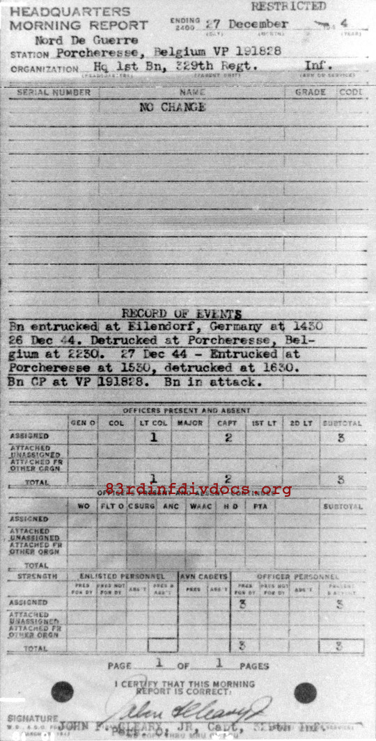 Bn entrucked at Eilendorf, Germany at 1430 26 Dec 44. Detrucked at Porcheresse, Belgium at 2230. 27 Dec 44 -- Entrucked at Porcheresse at 1530, detrucked at 1630. Bn CP at vP191828. Bn in attack