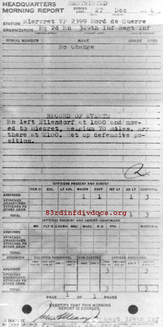 Bn left Eilendorf at 1600 and moved to Miecret, Belgium 70 miles. Arr there at 2100. Set up defensive position.
