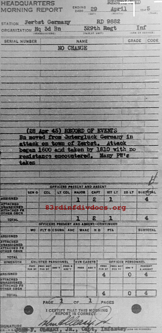 28 Apr 45 Bn moved from Gutergluck Germany in attack on town of Zerbst. Attack began 1600 and taken by 1810 with no resistance encountered. Many PWs taken.
