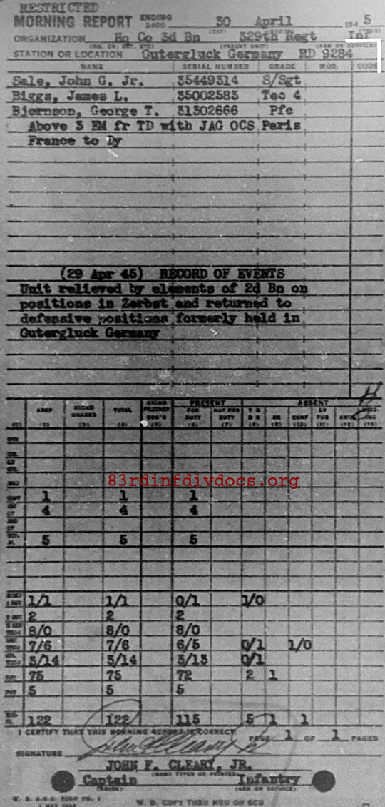 29 Apr 45 Unit relieved by elements of 2d Bn on positions in Zerbst and returned to defensive positions formerly held in Gutergluck Germany