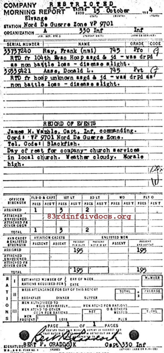 James M. Wamble, Capt, Inf, commanding. Cord: vP9701 Nord de Guerre Zone. Tel Code: Blackfish. Day of rest for company. Church services in local church. Weather cloudy. Morale high.